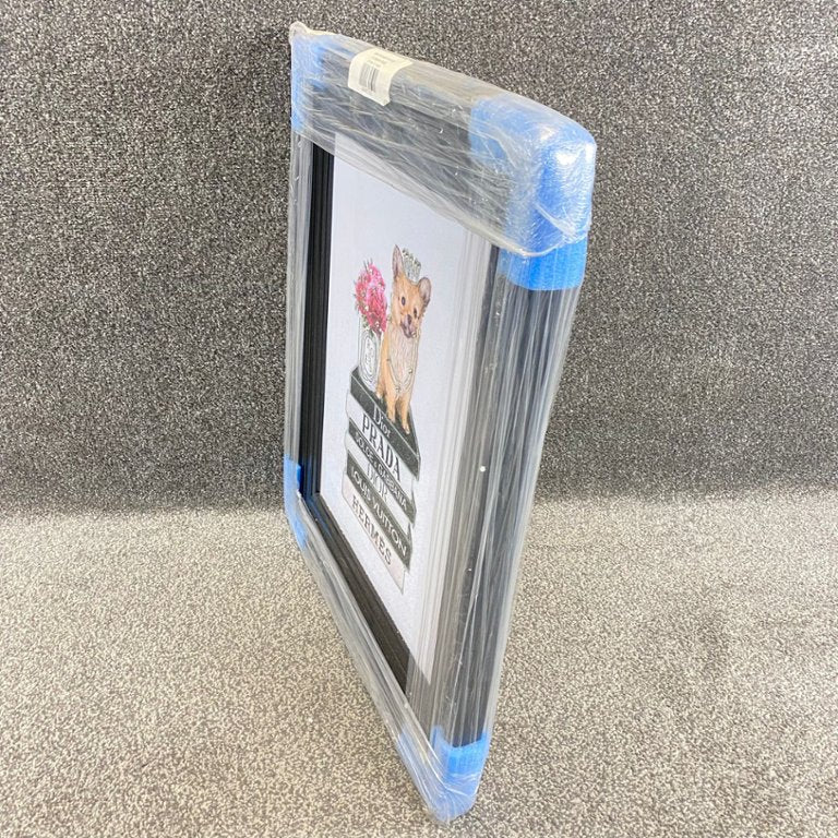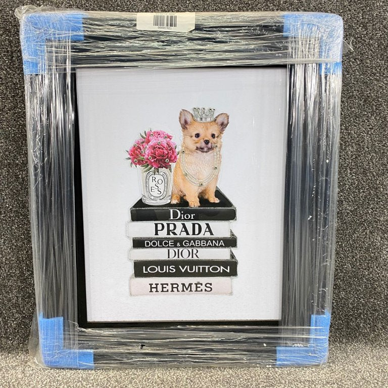 A framed liquid art picture of a Corgi sat on Designer Books.